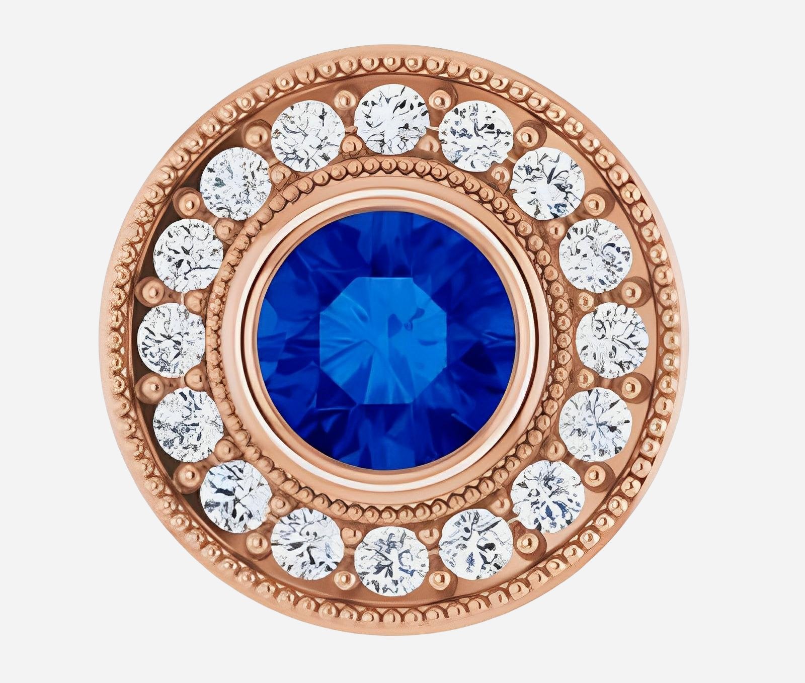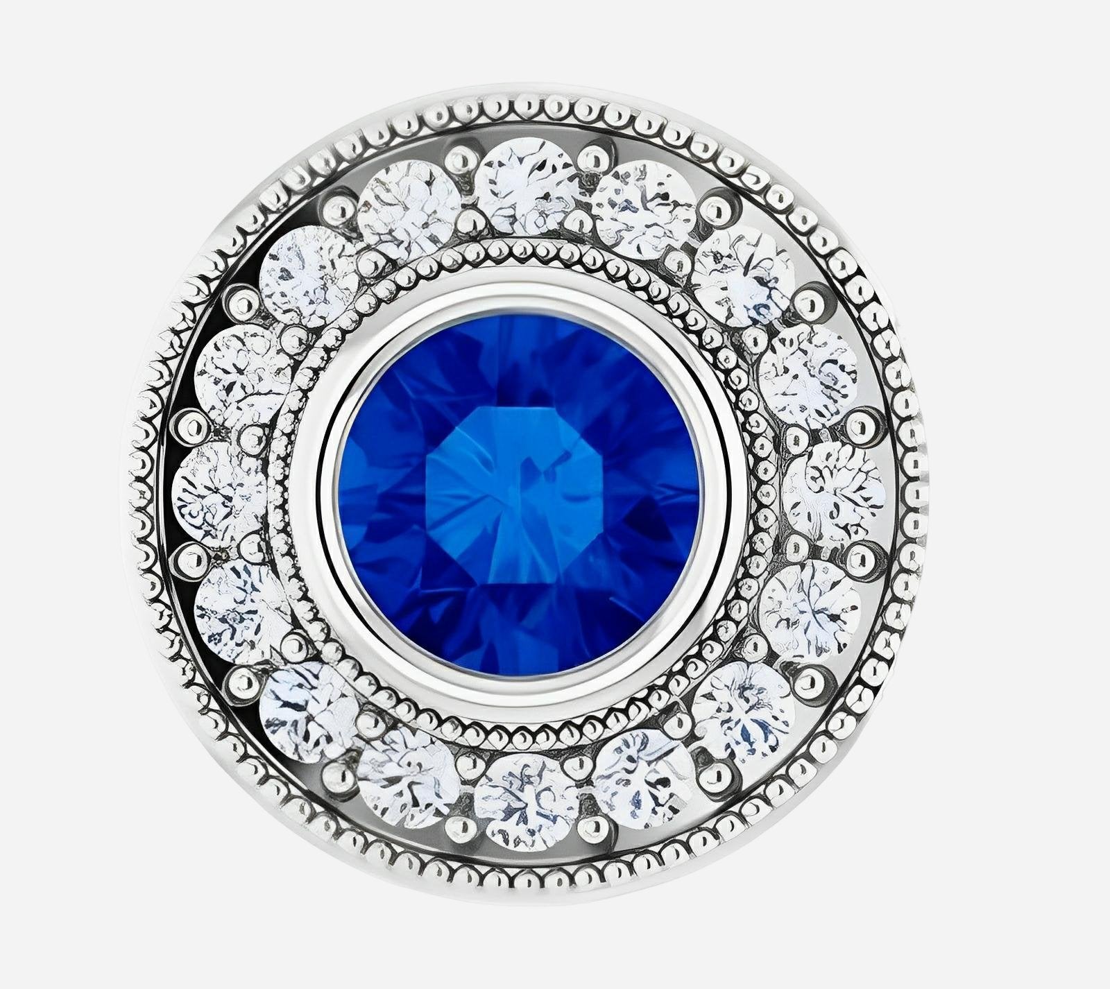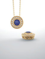 14kt yellow gold pendant featuring a lab grown blue sapphire and 16 lab grown diamonds weighing 1/15ctw graded chain included. HSF BEST PRICE ASSURANCE.