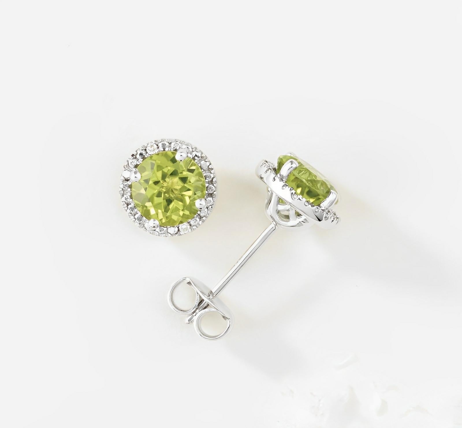 14kt white gold earrings featuring natural peridot embellished by natural diamonds graded SI2-SI3/GH, weighing 1/8ctw. Free shipping! HSF BEST PRICE ASSURANCE. qg