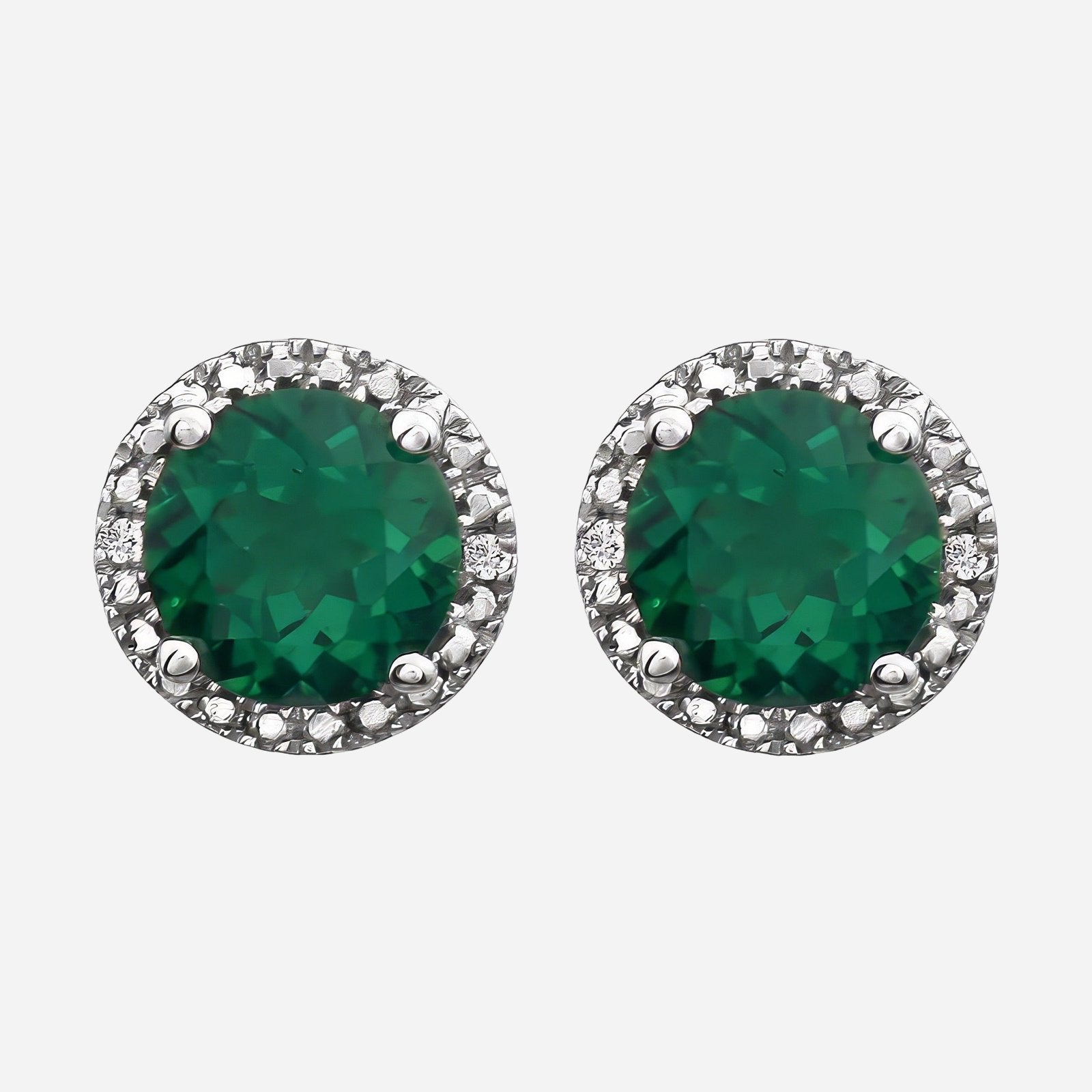 Elegance meets sustainability with these stunning sterling silver earrings featuring brilliant 6mm round lab-grown emeralds surrounded by a sparkling halo of natural diamonds (0.1 CTW total).